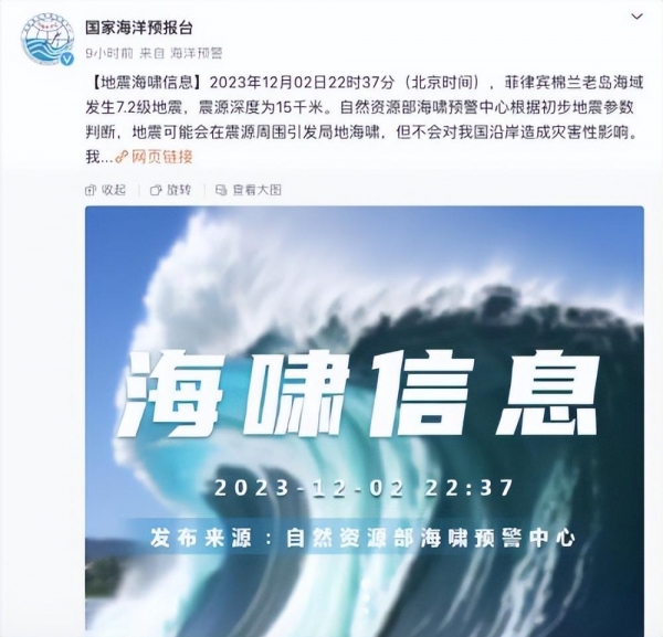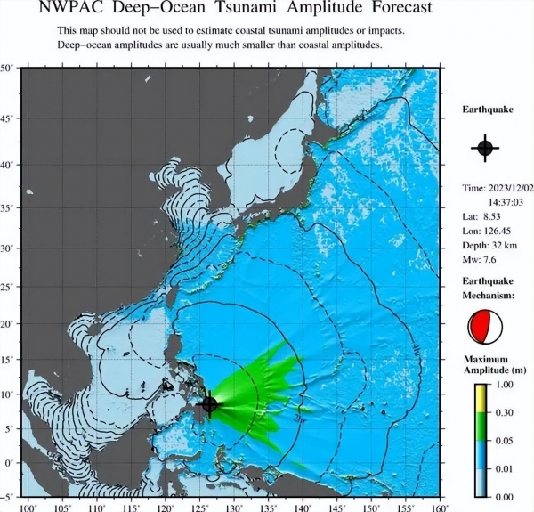 北京时间12月2日,菲律宾棉兰老岛附近海域发生了一次7.6级的地震,震源深度为10千米。菲律宾火山地震研究所立即发布了海啸预警,但在12月3日凌晨,这一预警被取消。