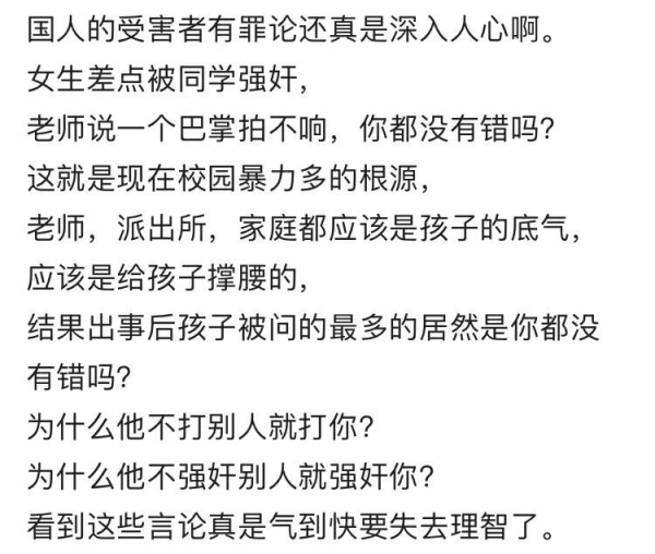 国人的受害者有罪论还真是深入人心啊。老师本应该是孩子的底气,应该是给孩子撑腰的,结果出事后孩子被问的最多的居然是你都没有错吗?