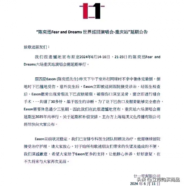 在此之前,陈奕迅方6月10号曾发布重庆站演唱会延期公告,声明称陈奕迅因打网球中暑休克晕倒,导致下巴撞地受伤,经医生检查之后,他腮骨出现骨裂及下巴皮肤破裂,破裂伤口深至见骨,当即进行了缝合手术,据悉,一共缝了有30多针。