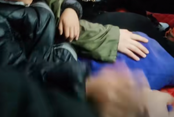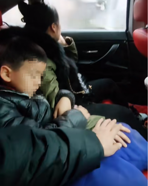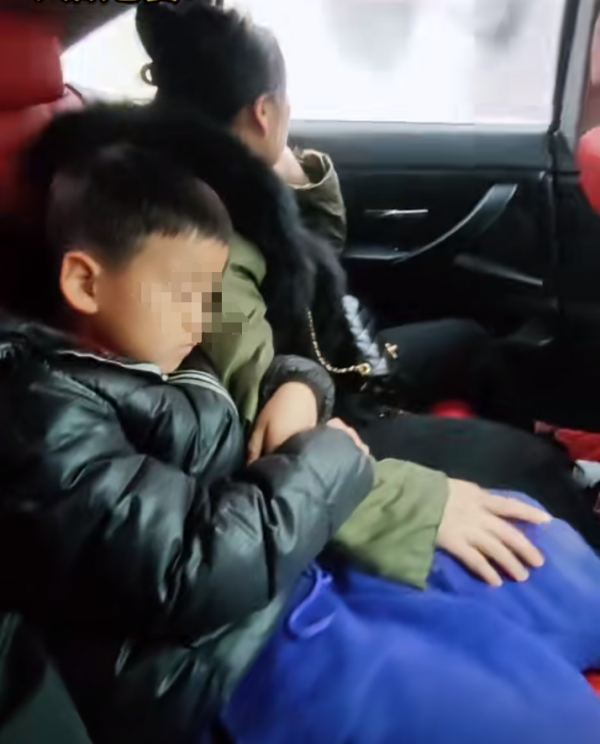 一家人坐车出去玩,男孩坐在中间睡着了,怀里还紧紧搂着母亲的胳膊。