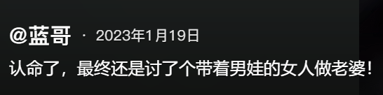他无奈得说道:"认命了。最终还是讨了个带着男娃的女人做老婆!"