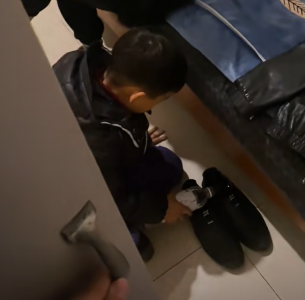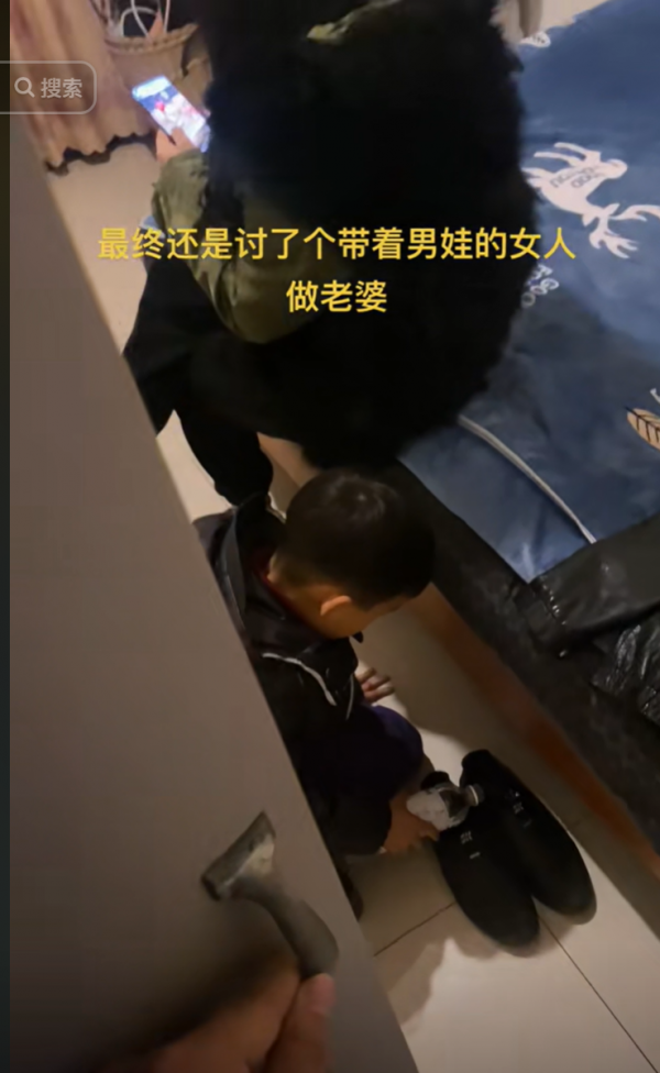 老婆正坐在床头背对着门专心的玩着手机,而小男孩就蹲在旁边,拿着矿泉水往他的皮鞋里面倒水。