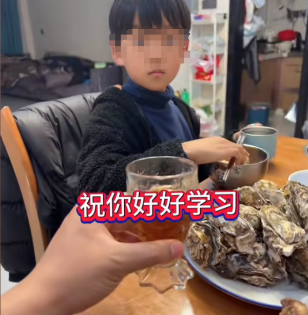 在吃饭的时候,蓝哥举杯祝福道:"儿子,祝你好好学习,天天向上"