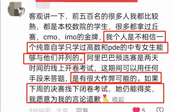 怀疑预选赛作弊,称预选赛线上开卷考试两天,有很大作弊可能,若姜萍决赛获奖他愿道歉。