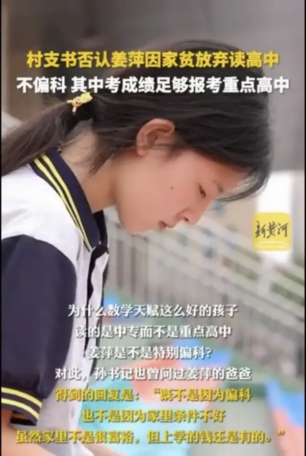 接受采访时,姜萍爸爸表示,女儿不是因为偏科,也不是因为家里条件不好,家里虽然不是很富裕,但上学的钱还是有的。