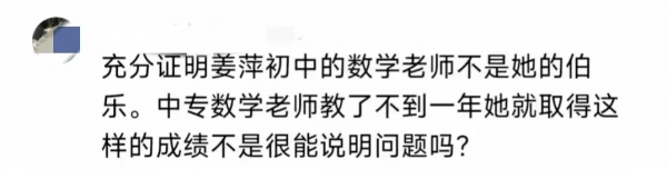 还有另外一种声音:"充分证明姜萍初中的数学老师不是她的伯乐,中专数学老师教了不到一年,就取得这样的成绩,不是很能说明问题么?"