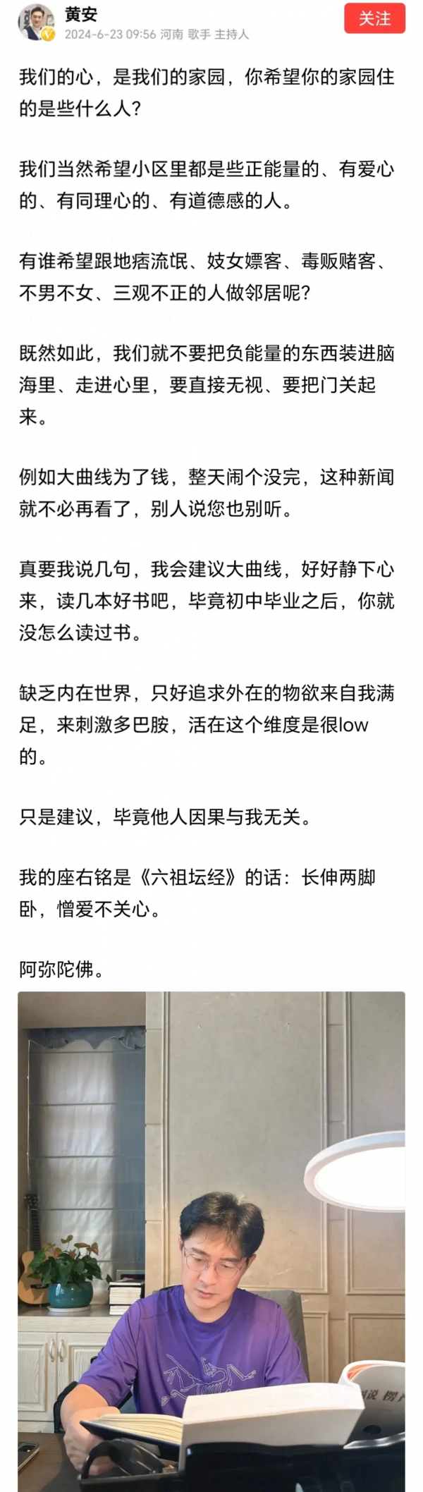 "大曲线为了钱,整天闹个没完,好好静下心来,读几本好书吧,毕竟初中毕业之后,就没怎么读过书。缺乏内在世界,只好追求外在的物欲来自我满足,来刺激多巴胺,活在这个维度是很low的。"