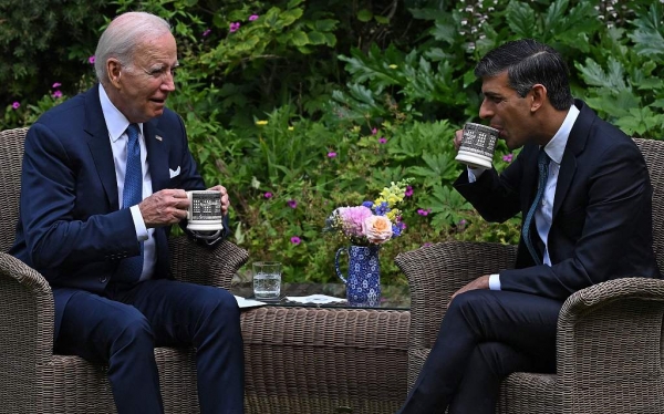 当地时间7月10日,苏纳克和拜登在唐宁街10号的花园会面。图片来源:视觉中国