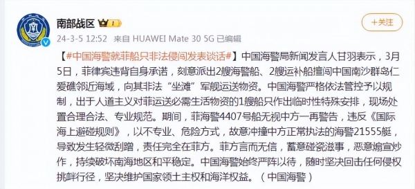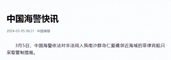 事发后,中国海警只是发表了一条简短的快讯称,依法对擅闯仁爱礁的菲方船只采取管制措施。