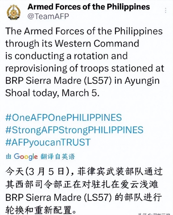 今天(3月5日),菲律宾武装部队通过其西部司令部正在对驻扎在爱云浅滩BRP Sierra Madre(LS57)的部队进行轮换和重新配置。