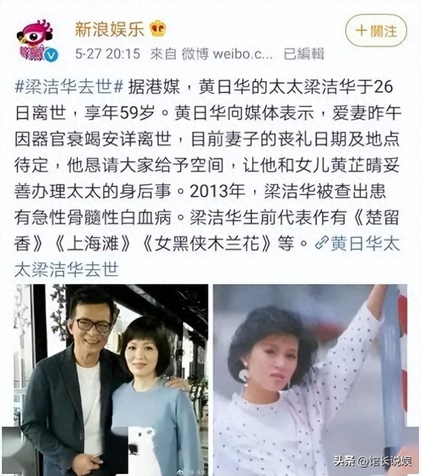 尽管历经数次化疗,妻子梁洁华最终还是离世,留下黄日华独自承受丧妻之痛。
