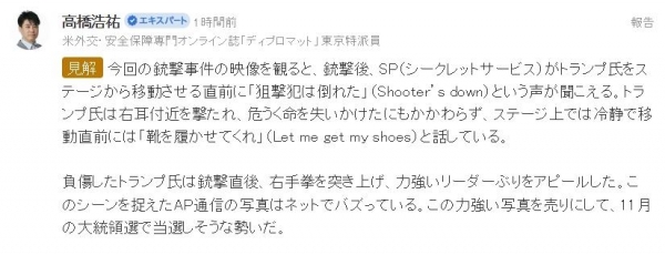 日本媒体人分析:特朗普在被枪击穿右耳后,脸上流着血,用力举起右手拳头,在离开演讲舞台前冷静地对特勤局说:"给我穿鞋。"看了这段视频的不少观众,都认为特朗普是个有胆识的人,适合作为非常时期的领导人。