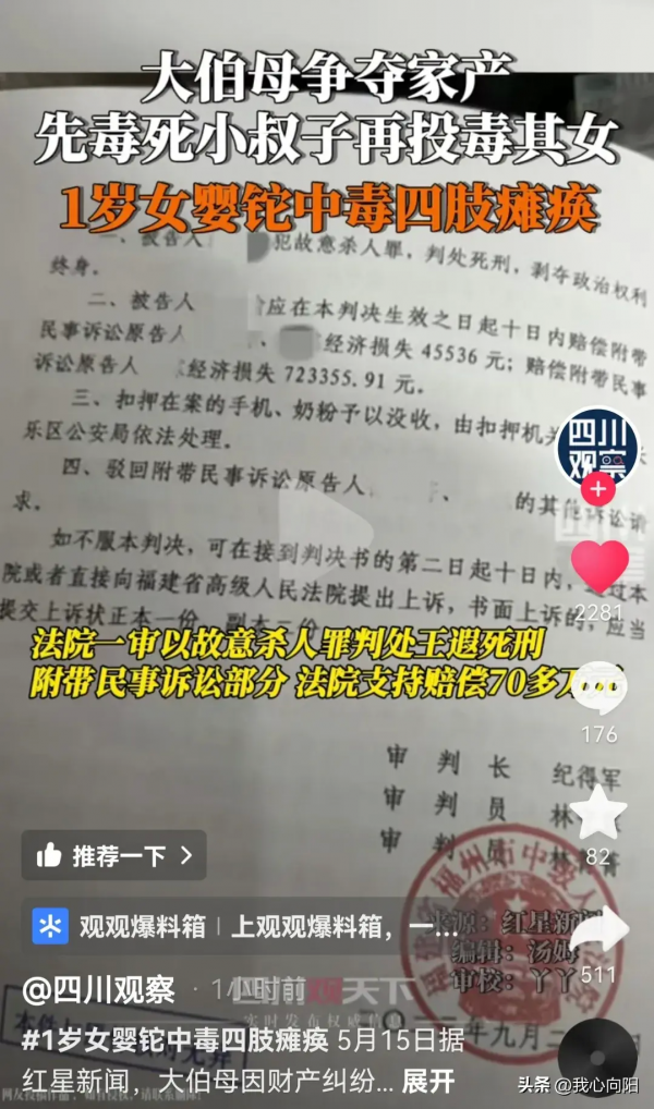据媒体曝料,2022年春节,福建一岁女婴竟然铊中毒,警方调查后发现,是其大伯母王遐奶粉中投毒所致,而女婴的父亲,半年前去世,被鉴定为秋水仙碱中毒导致的。