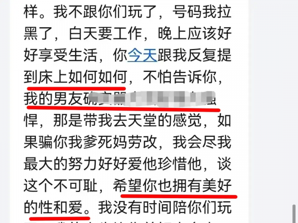 在小三回复的几百字消息中,最后又提到了自己新交的男朋友,并表示自己会努力的爱他珍惜他,也希望局长夫人得到X与爱。
