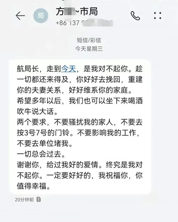 果不其然,经过众人的深扒,小三给局长也发送了一条分手的信息,她的文章信息很平和,她说:"航局长,我对不起你,趁一切还来得及,你去挽回你的夫妻关系,希望多年以后,我们可以坐下来喝酒吹牛说大话,最后两个要求,不要骚扰我的家人,不要影响我的工作!"
