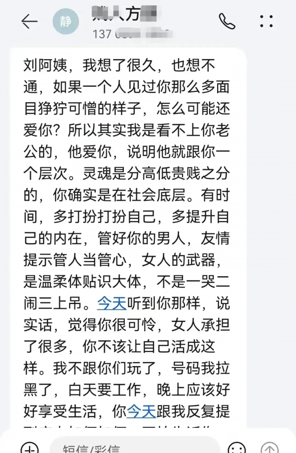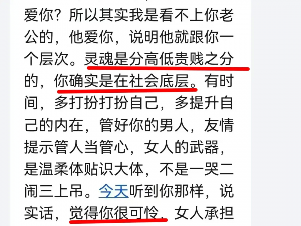 随后,举报者又爆料了小三的挑衅信息,从文字中就可以看出这名做了小三的女人有多猖狂,从头到尾不仅挑衅原配,还把原配进行了一番羞辱,消息中提到"灵魂是分高低贵贱之分的","我觉得你很可怜","你确实生活在社会最底层","我不想跟你这烂人烂事纠缠"。
