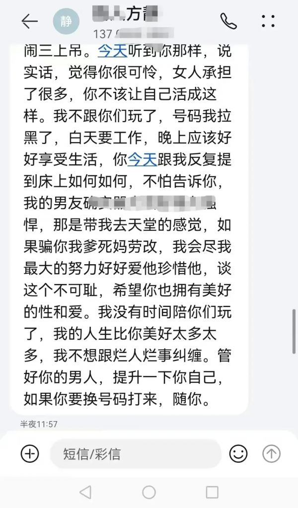 小三在消息中说:"你今天反复跟我提到床上如何如何,我不怕告诉你,我男朋友确实比你的局长老公要强悍很多!"