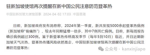 中国驻新加坡大使馆于上周发文,提醒注意防范登革热症:
