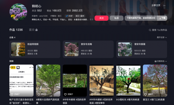 他开通了个人账号,在短视频平台上,分享寺庙寂静悠然,清新自然的风光。