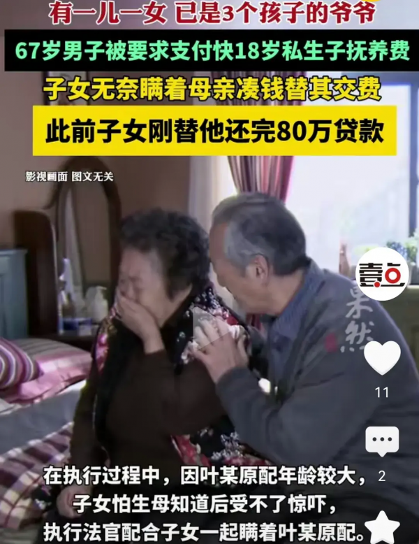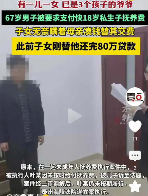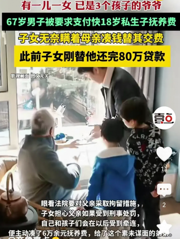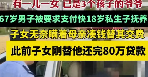 67岁老人在外有私生子 子女凑钱交抚养费,已替其还80万