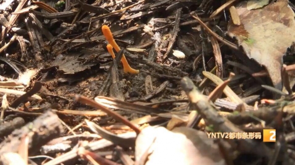 在一片枯枝落叶丛里,队员们发现了一小株特殊的橙色植物,很像我们平常吃的虫草花。