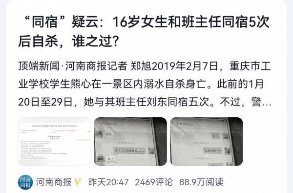 近期,重庆市工业学校刘某和年仅16岁的女生同宿5次,女生熊某溺水身亡的消息传遍网络,刘姓班主任的所作所为引发网友关注,许多网友认为事情没那么简单。