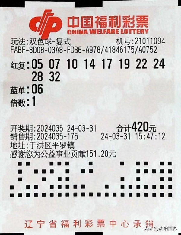 辽宁中出的1注一等奖花落沈城,中奖彩票出自位于沈阳市于洪区平罗镇平罗中路98-10号的21011094号福彩销售网点。中奖彩票采用自选"10+1"复式投注,除了中得1注一等奖,同时中得24注三等奖、90注四等奖、80注五等奖和15注六等奖,奖金合计5,916,907元。
