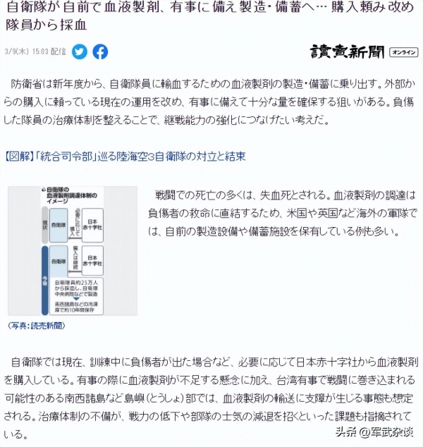 正如上文所说,日本自卫队此前的血液制品主要来源于日本红十字会,自己是没有进行相关储备的。因此,如果要应对在战时出现的大量伤员"求血"的情况,那么日本自卫队目前确实需要开始大量储存血液制剂。而从日本民间大规模征集会引发大量日本民众的反对和抗议,所以找来找去,日本防卫省确实只能从自卫队自己身上先抽一些存起来了。