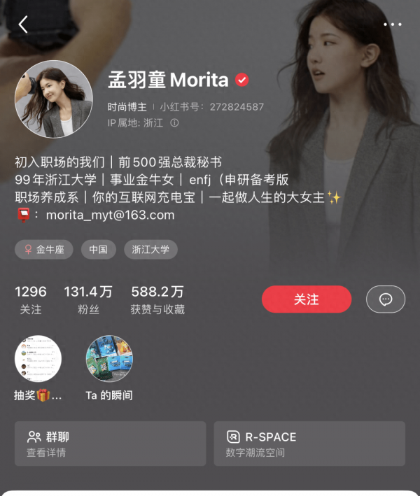 据孟羽童在小红书社交平台上的账号"孟羽童Morita"显示,该账号标签之一为"前500强总裁秘书",显示粉丝数131.4万人,获赞与收藏587.5万个。