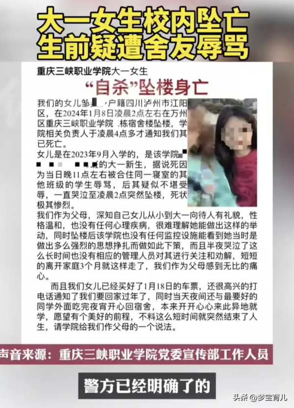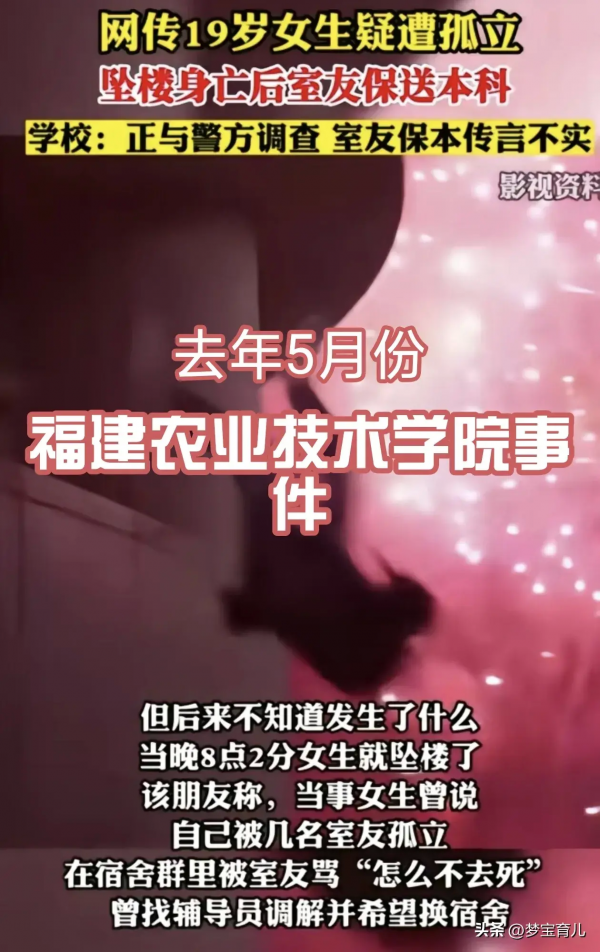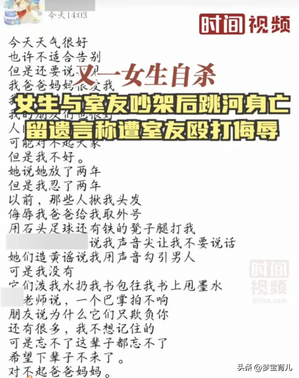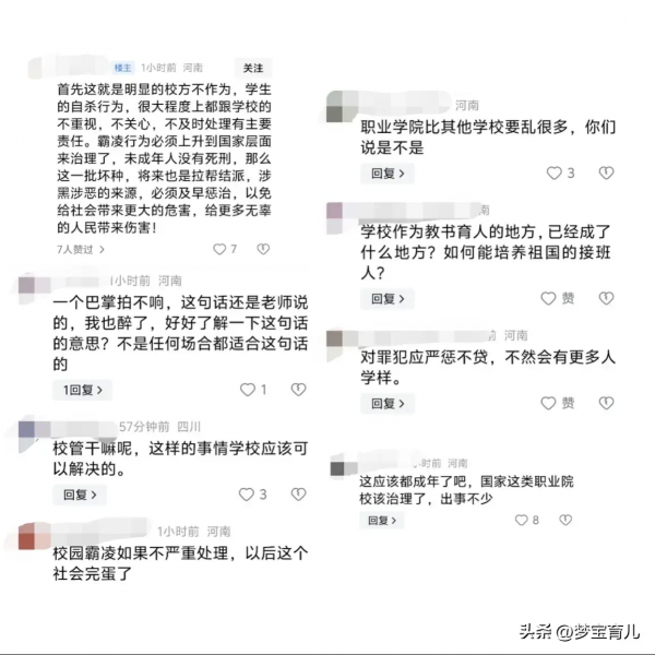 看到上诉网友的评论"职校比其它学校要乱很多"我骤然意识到了什么,去年5月份和今年1月份的职校霸凌事件依然历历在目,然后如今才过了多久?均是职校女子因不堪霸凌而自寻短见,她们皆是祖国未来的花朵,父母疼爱的宝贝呀。