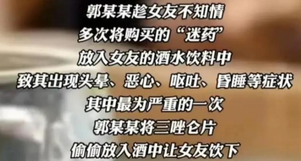 在一次偶然的机会中,郭某在网上浏览到了迷药。再看介绍的时候,心中顿时火热,最终不差钱的他大手一挥,购买了足够量的迷药,还把这些迷药,悄悄倒入女友的水杯中,让女友昏迷倒地,拖入房间之中,行平日里女友嫌弃脏,而不想做的事。