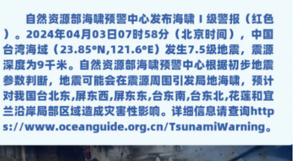据国家预警信息发布中心消息,自然资源部海啸预警中心发布海啸Ⅰ级警报(红色)。中国地震台网正式测定:04月03日07时58分在台湾花莲县海域(北纬23.81度,东经121.74度)发生7.3级地震,震源深度12千米。根据推断,地震引发的海啸或对我国台北东,屏东西,屏东东,台东南,台东北,花莲和宜兰沿岸局部区域造成灾害性影响。据大陆网友社媒发布,大陆福建广东多地也有明显震感。