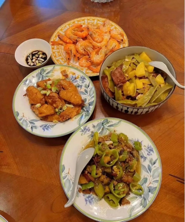 王岳伦给她做的是家常菜,土豆豆角烧排骨,红烧鸡翅,辣椒炒肉和油焖大虾,色香味俱全,又家常味十足。对于吃惯了精致西餐,美味珍馐的王诗龄来说,这种家常菜更难得。