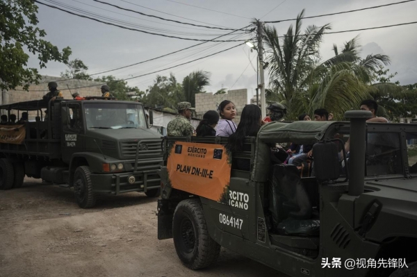 2024年7月4日,在贝里尔飓风预计到来之前,国民警卫队士兵将人们带到墨西哥尤卡坦半岛的一个紧急庇护场所。