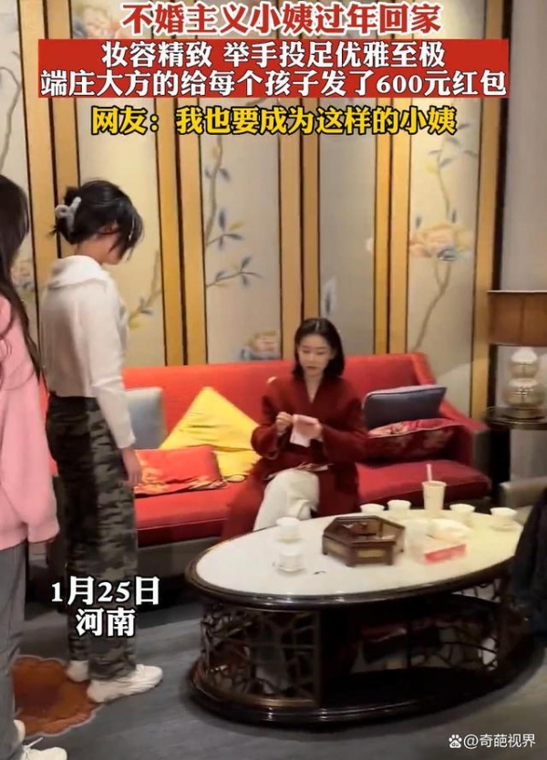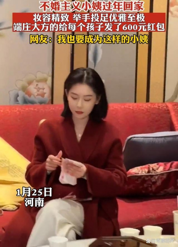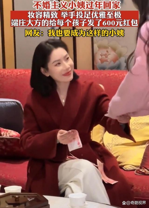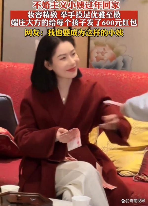 只见她上身穿着酒红色外衣,下身搭配白色西装裤,整个人坐在沙发上翘起二郎腿,看起来气质非凡,此时她正面带微笑举止优雅地给小孩子们发红包,一瞥一笑尽显端庄大方,而在得知她是家里不婚主义的小姨后,网友们对此纷纷不淡定了。