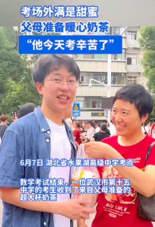 "他今天考辛苦了,6月7日 湖北省水果湖高级中学考点,数学考试结束,一位武汉市第十五中学的考生收到了来自父母准备的超大杯奶茶。