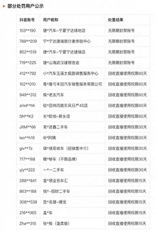根据部分处罚用户公示,被质疑"擦边"营销的"捷途汽车-宁夏宁达捷瑞店"抖音账号被无限期封禁。