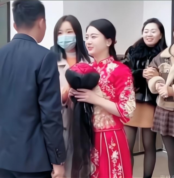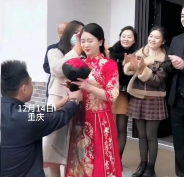 新娘一袭大红色喜服笑容甜蜜,看到新郎单膝跪地就立刻接过他手里的鲜花,似乎生怕新郎在这种场合没面子。