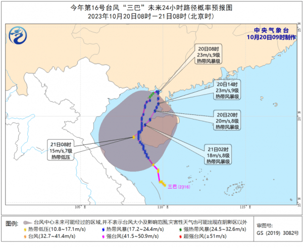先关注台风最新动向,今8时,台风"三巴"的中心位于雷州半岛西部近海海面上,中心附近最大风力有9级(热带风暴级,23米/秒),中心最低气压为988百帕。预计,其将以每小时10公里左右的速度向偏南方向移动,可能擦过或登陆雷州半岛西部至海南岛西北部一带沿海,强度逐渐减弱。中央气象台今晨继续发布台风蓝色预警。