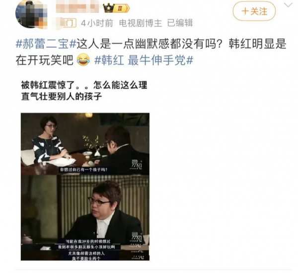 不过也有网友觉得韩红就是在采访中开开玩笑,认为大家过于认真了,一点幽默感没有。