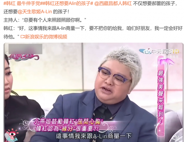 有网友发现,原来不止郝蕾,韩红也曾在另一档采访中,当场向歌手A-Lin要孩子。