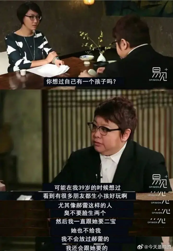 接着她又说,在她39岁的时候,看到身边朋友都生小孩子,很好玩,会有点想要孩子。特别是像郝蕾这样的人,臭不要脸生两个。她很喜欢郝蕾的二宝,于是一直跟郝蕾要二宝,但郝蕾没答应给她。