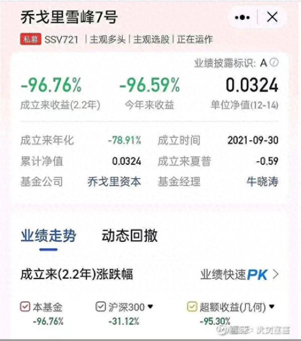 渠道人士提供的净值表显示,截至12月14日,乔戈里雪峰7号私募证券投资基金单位净值已经跌至0.0324元。