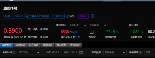 同样是主观多头策略的卓晔1号私募证券投资基金也业绩惨淡。私募排排网数据显示,截至12月15日,该基金成立以来亏损幅度高达61%,单位净值跌至0.39元。