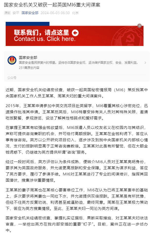 国家安全机关经缜密侦查、掌握扎实证据后,果断采取措施,对王某某夫妇依法审查,一举挖出英方在我内部安插的重要"钉子"。目前,案件正在进一步侦办中。