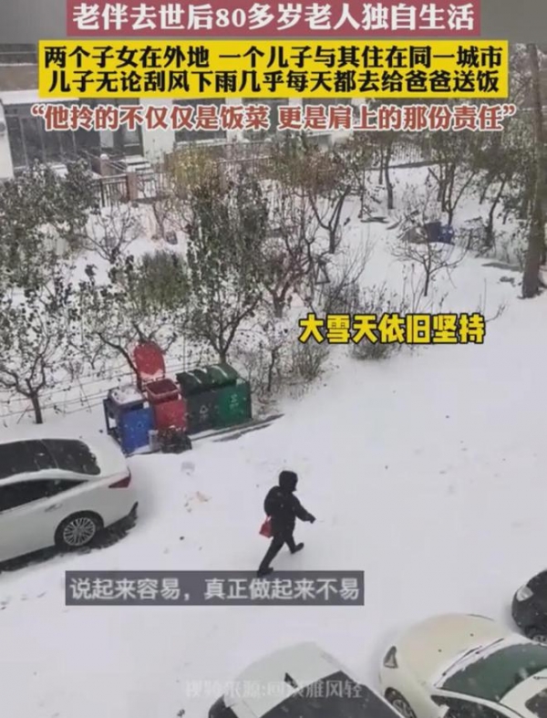 女子表示,今天下暴雪,丈夫还是一如既往去送饭。自己做好饭后,他装好,赶紧给他父亲送去。