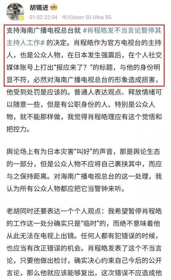 这篇文章一经发表,立刻引发了众多网友的热议,有人支持胡锡进的观点,认为海南台的处罚过当;也有人持不同意见,认为程皓的行为不可原谅。