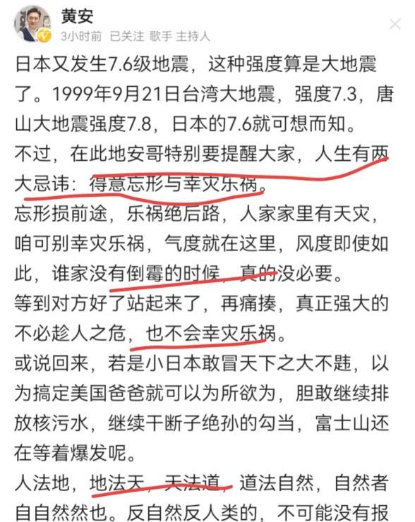然而,因为对日本排放核污水的反对,海南主持人程皓在个人账号上发表了一条引人注目的言论,称这次地震是对日本的"报应"。