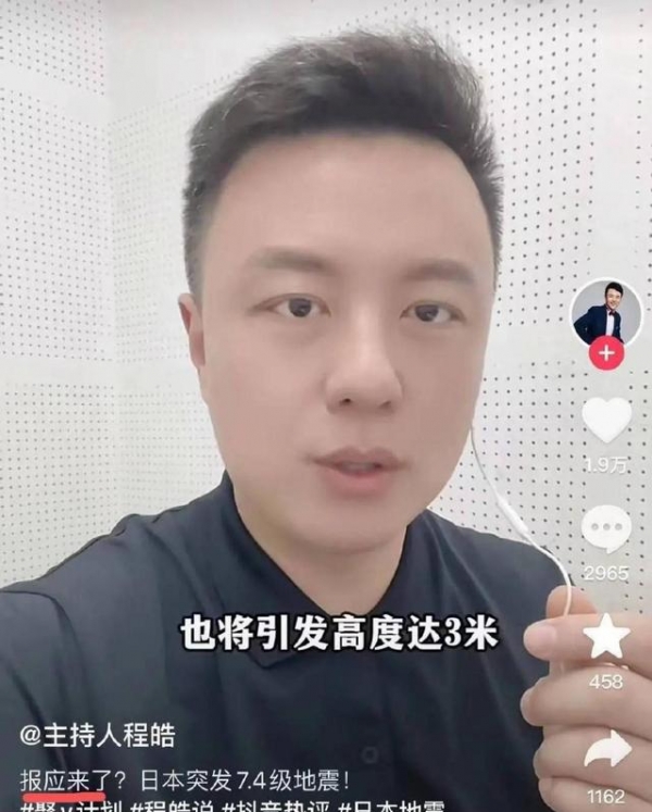 1月1日,日本发生了强烈的7.4级地震,消息传到国内后,网友们的反应也是两极分化。有人为日本祈福,有人则拍手叫好。而程皓在短视频平台上的言论激起了轩然大波。