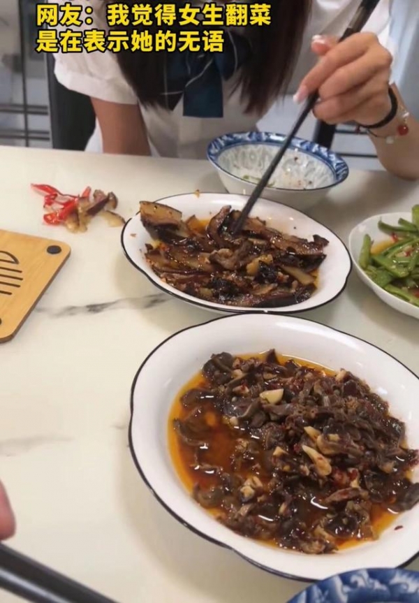 她不仅扒拉自己眼前的饭菜,就连别人跟前的饭菜也扒拉,甚至有些菜都被扒拉到了桌子上,看上去让人直皱眉:这是什么教养?难道她在家吃饭也这样吗?